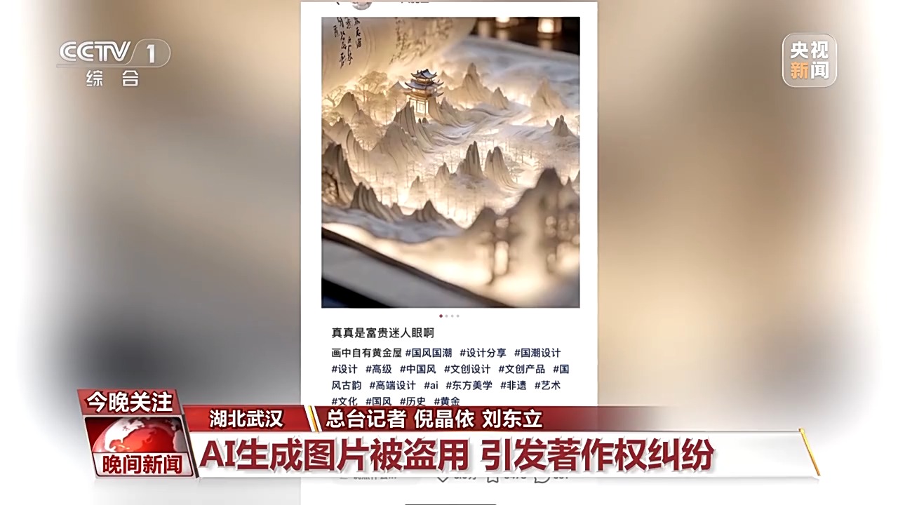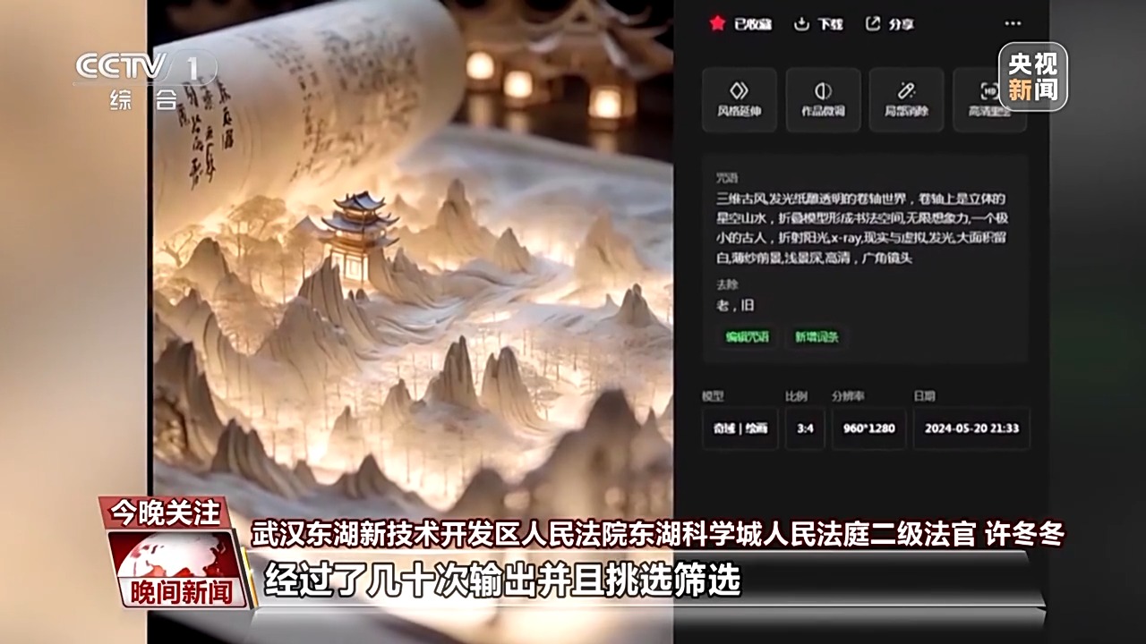 武汉东湖新技术开发区人民法院东湖科学城人民法庭二级法官 许冬冬:首先应当看原告王某输入的关键词及参数是否达到了独创性的标准;第二个是原告的创作活动和生成作品的关联性,原告在创作的时候输入了几十个关键词,比如卷轴、光影效果、远景等等,经过了几十次输出并且挑选筛选,最终获得了涉案图片。