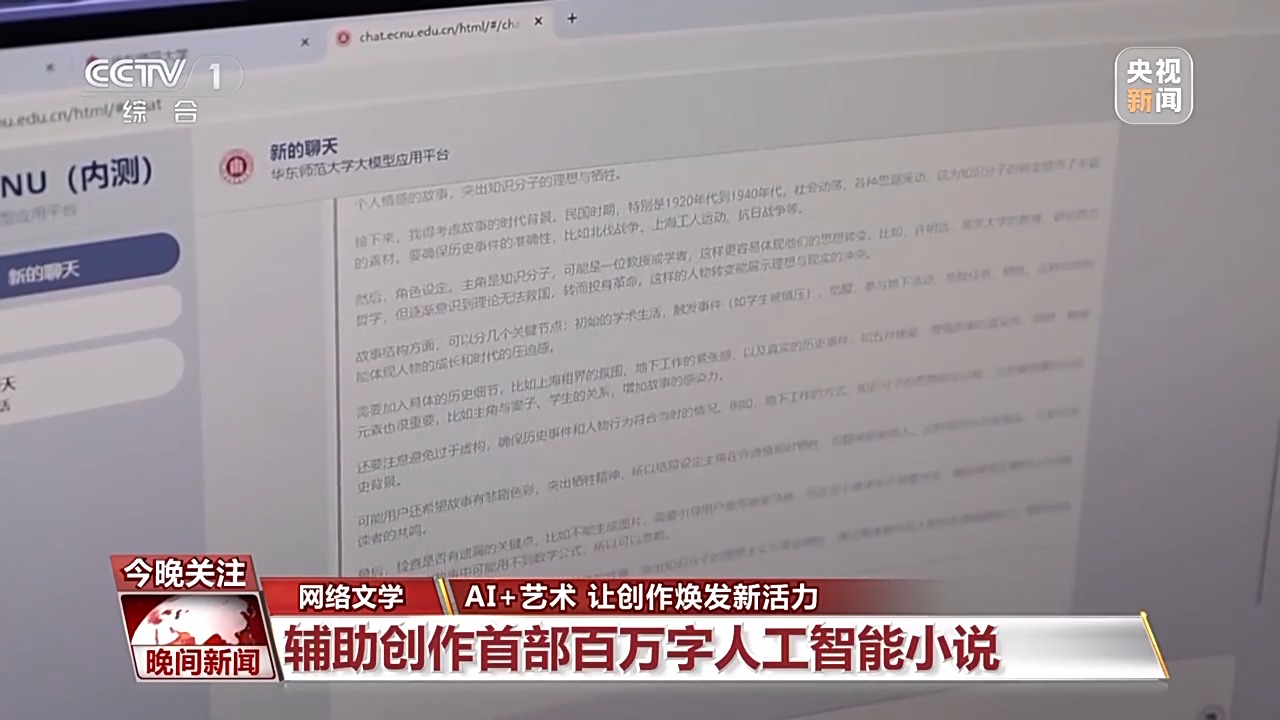 在文学领域,AI也提供了全新的写作模式。日前,华东师范大学用AI以“人工智能大语言模型+提示词工程+人工后期润色”的方式,创作出国内首部百万字人工智能小说。人工设计故事框架、提示词,AI完成人物关系图谱、批量段落写作、完善故事细节。一位勤奋的写手,全年无休写作完成这样一部作品需要一年半,而用AI的方式只需要一个半月。
