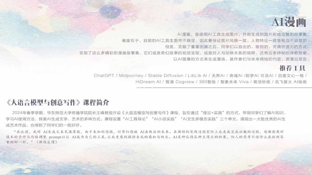 在这门课程中,王峰教授通过“理论+实践”的方式,带领同学们了解AI知识,学习AI使用方法,探索AI生成文学、艺术的多种方式。课程不仅涌现出一大批优秀的AI生成艺术作品,也得到了同学们的一致好评,让同学们能够在实践中逐渐理解AI,使用AI,调整提示词来让AI成为自己的工具,从而感受到了艺术创作的快乐。这些作品不仅是作者们与未来缔结的约定,更是技术时代浪漫且坚定的探索。