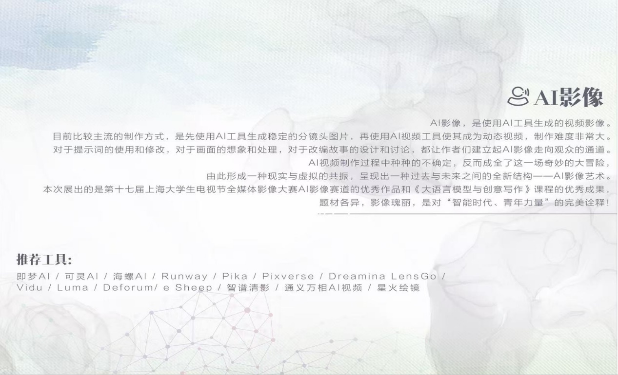 AI影像展区展出了使用AI工具生成的十三部影像作品,本次展出的是《大语言模型与创意写作》课程的优秀成果和第十七届上海大学生电视节全媒体影像大赛AI影像赛道的优秀作品。大赛以“智能时代、青年力量”为主题,由华东师范大学传播学院,上海广播电视台互联网节目中心承办,设置AI影像、MINI电影、视频广告三大赛道,其中AI影像的获奖作品题材各异,展现出了当代青年的风采。