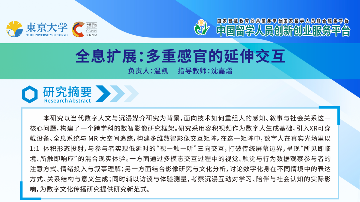12月11日,“春晖计划”三十周年纪念暨2025春晖中国留学人员创新创业交流活动在上海国家会展中心举行。在500余名海内外嘉宾的见证下,教育部发布了2025年度春晖创新创业优秀成果名单。传播学院沈嘉熠教授团队打造的“未来影像”系列子项目《全息扩展:多重感官的延伸交互》成功入选优秀创新成果,成为“人文艺术与社会科学”赛道15项优秀成果之一。开幕式上,中国科协主席万钢、教育部副部长任友群等领导对入选成果表示热烈祝贺,并勉励创新团队勇攀高峰、加速成果转化。