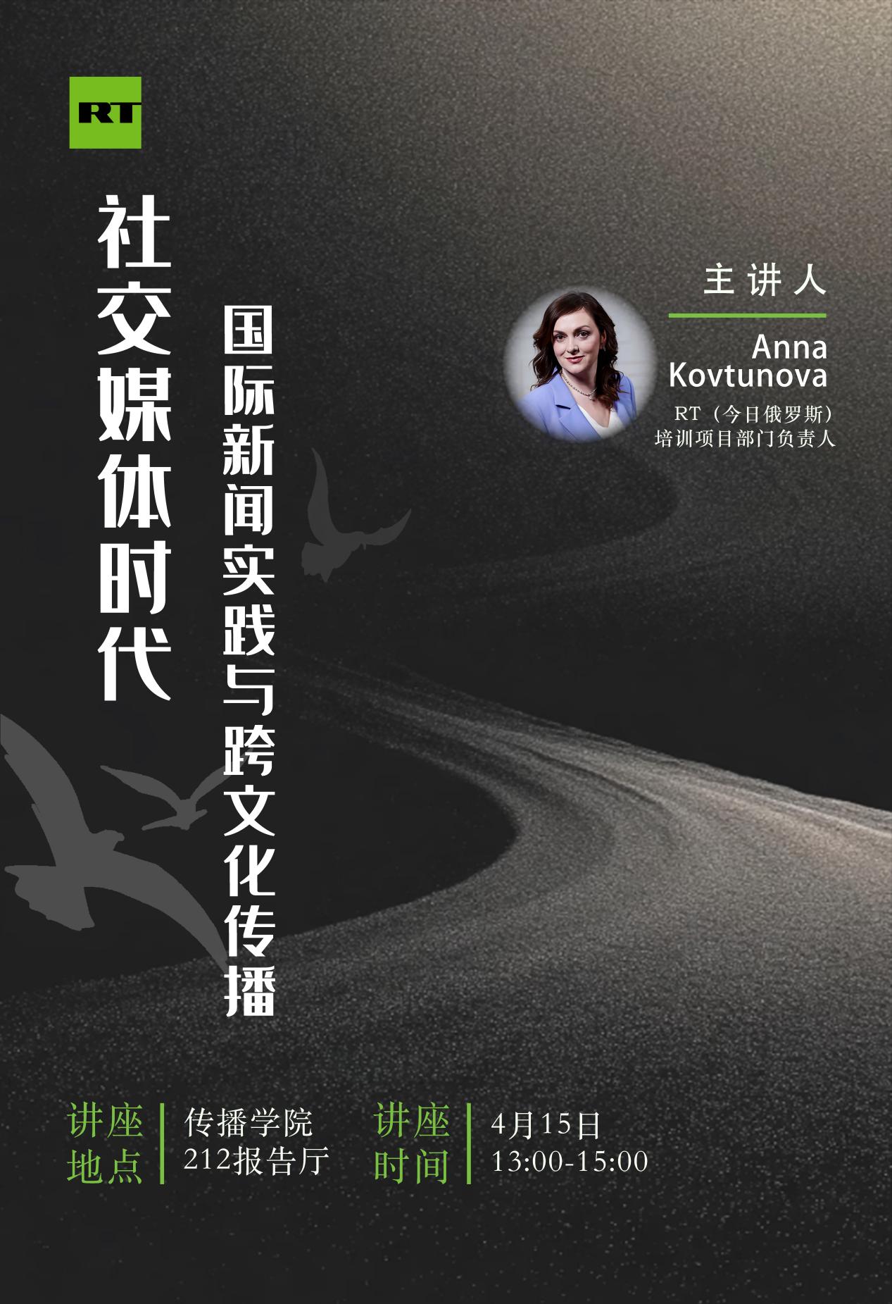主要介绍RT在中国的新闻生产与运营,结合跨文化传播的理论,介绍国际新闻实践的特点,与青年学子交流。