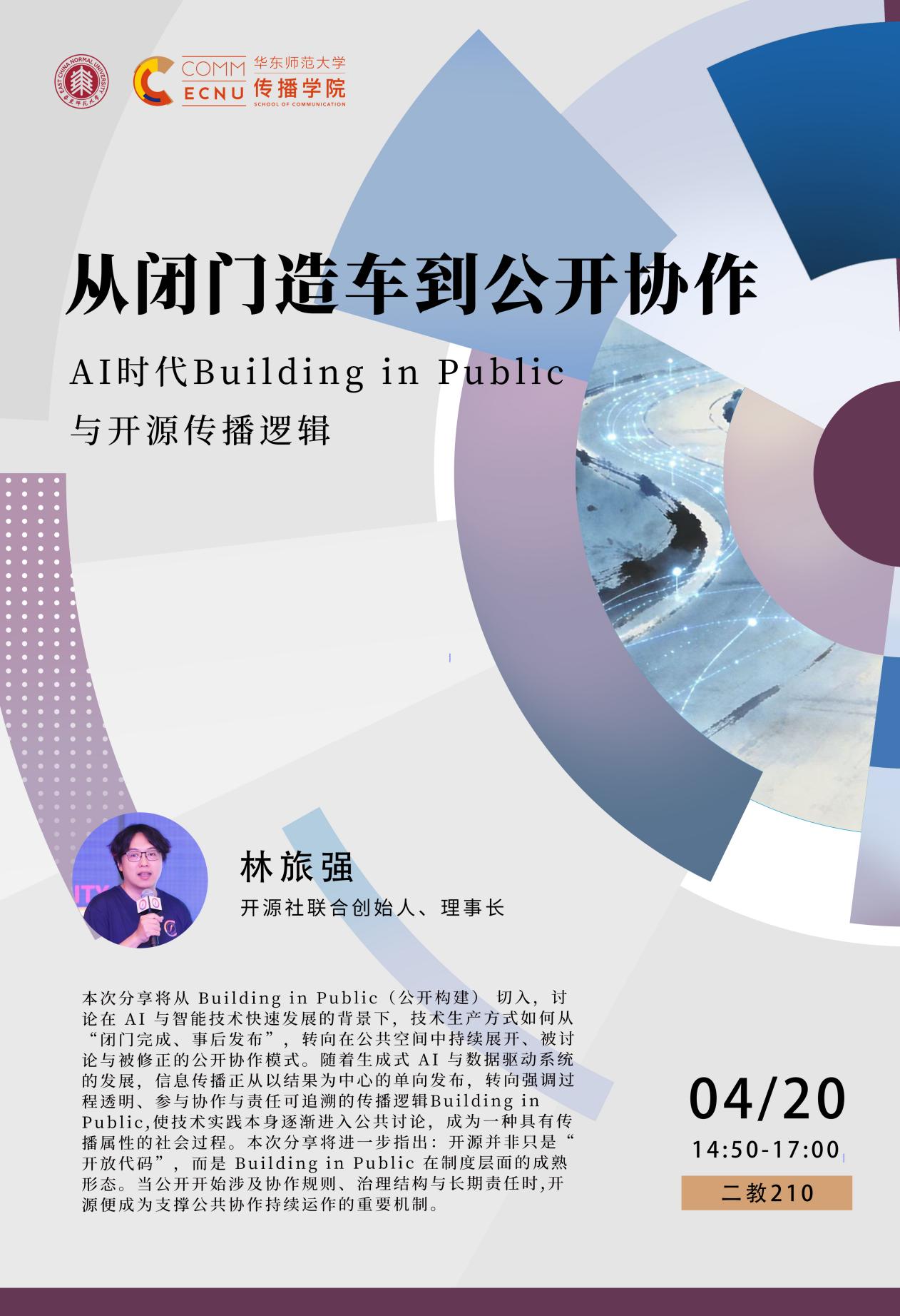 讲座预告 | 林旅强:从闭门造车到公开协作:AI时代的Building in Public与开源传播逻辑